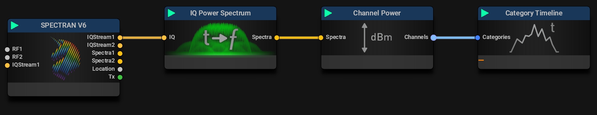 安诺尼V6实时频谱分析仪Category Timeline模块提供了强大的多信道时间线图: