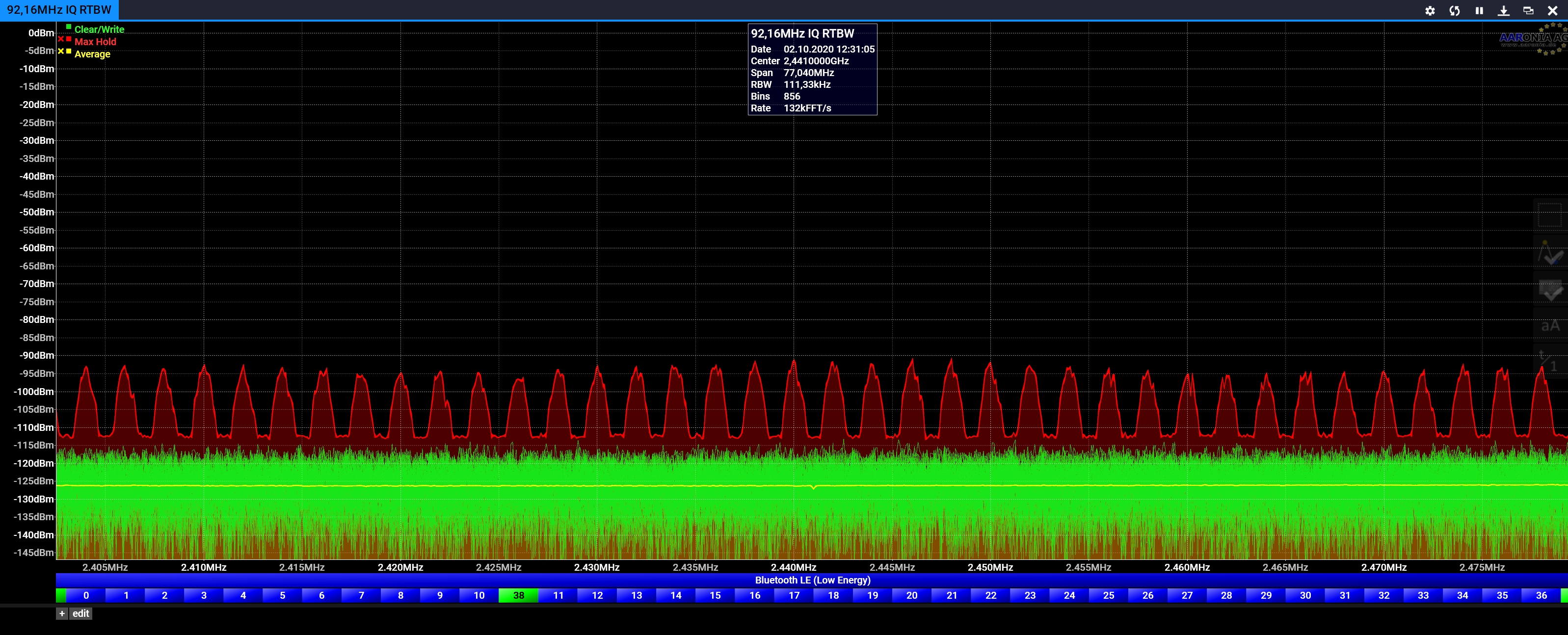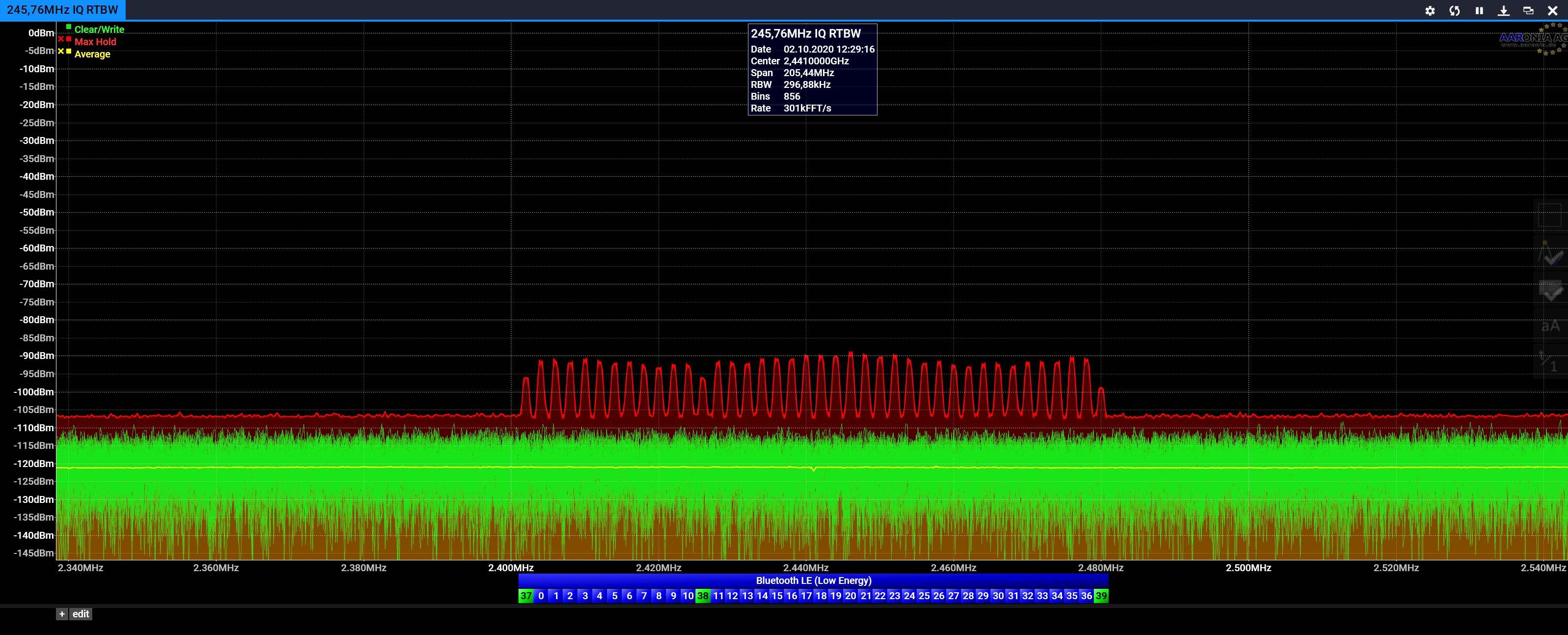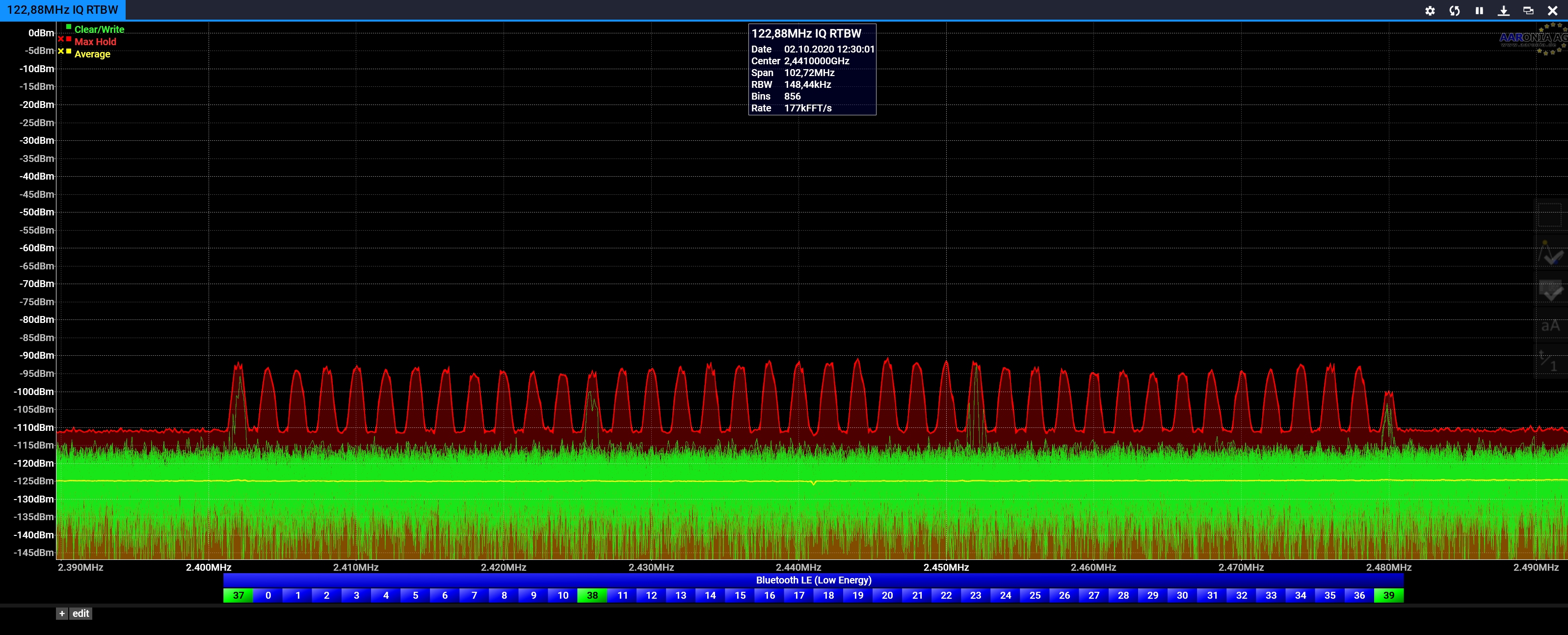https://v6-forum.aaronia.de/forum/topic/spectran-v6-rtbws/随附的示例屏幕截图显示了具有不同RTBW的2,4GHz Wifi频段(只需打开SMA连接器,因此无需校准信号)。