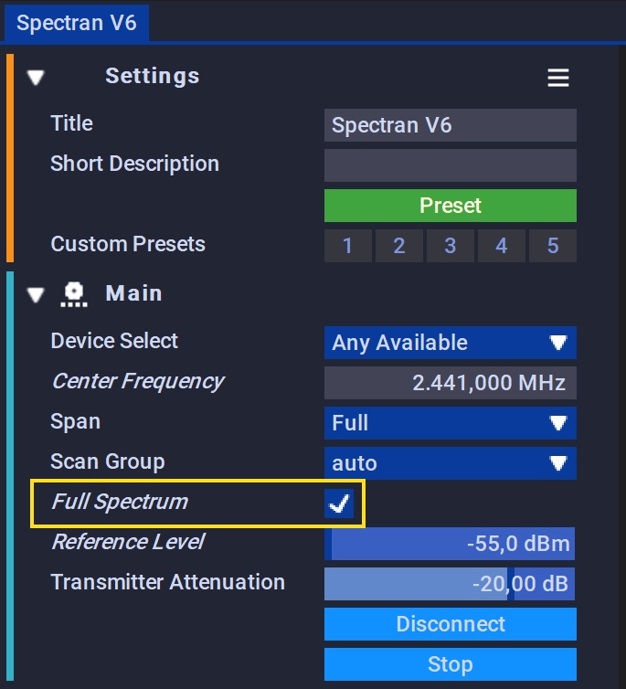 将RTBW模式更改为“全频谱”将为您提供完整的IQ带宽,但在频谱的开始和末尾将减少大约2-4dB的动态。 例如。 而不是默认的76,32MHz RTBW,您将获得具有完整92,16MHz IQ带宽的RTBW。 多数民众赞成在额外的15MHz可以有很大的不同。