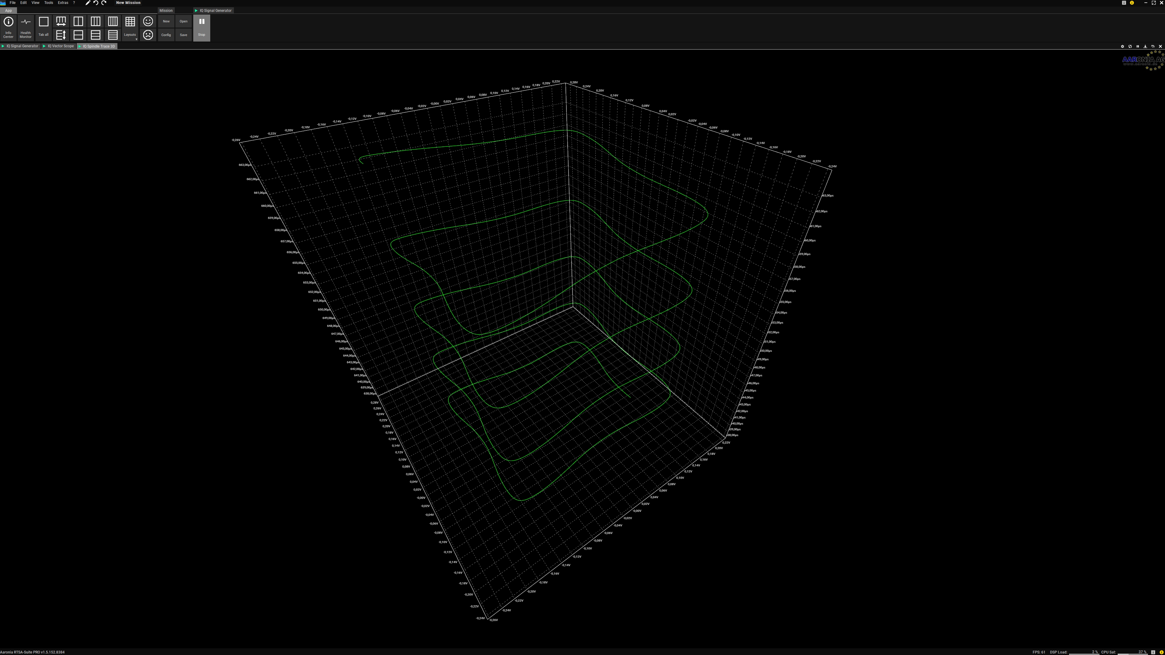 IQ Spindel Trace 3D模块的功能是用3D矢量图显示数字调制信号,以X-Y轴表示I-Q信号,以Z轴表示时间,给数字调制信号提供了独特3D视图,这是德国安诺尼RTSA软件特有的功能: